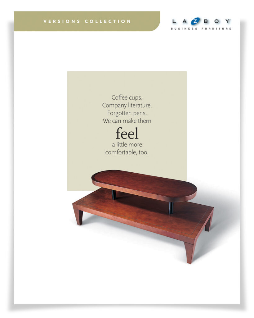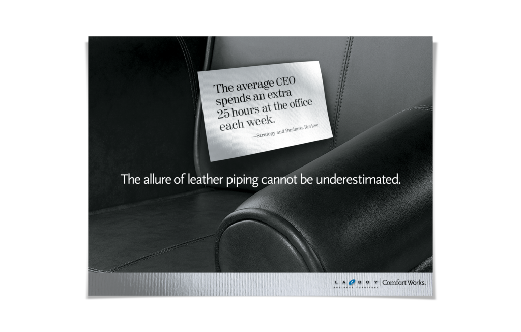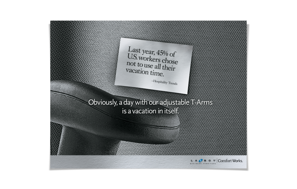 The challenge: convince interior designers that the consumer brand most known for their bulky recliners and plaid upholstery was the right choice for their sophisticated business-to-business clientele. The solution: demonstrate the relevance of “comfort” in the workplace while at the same time dramatizing the design of the furniture with extreme close-ups, unusual camera angles and long shadows—a visual style unheard of in this space.