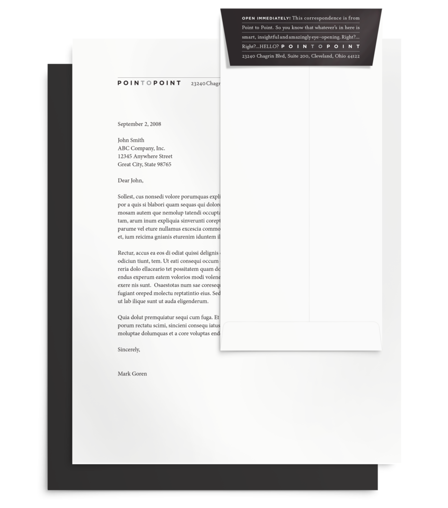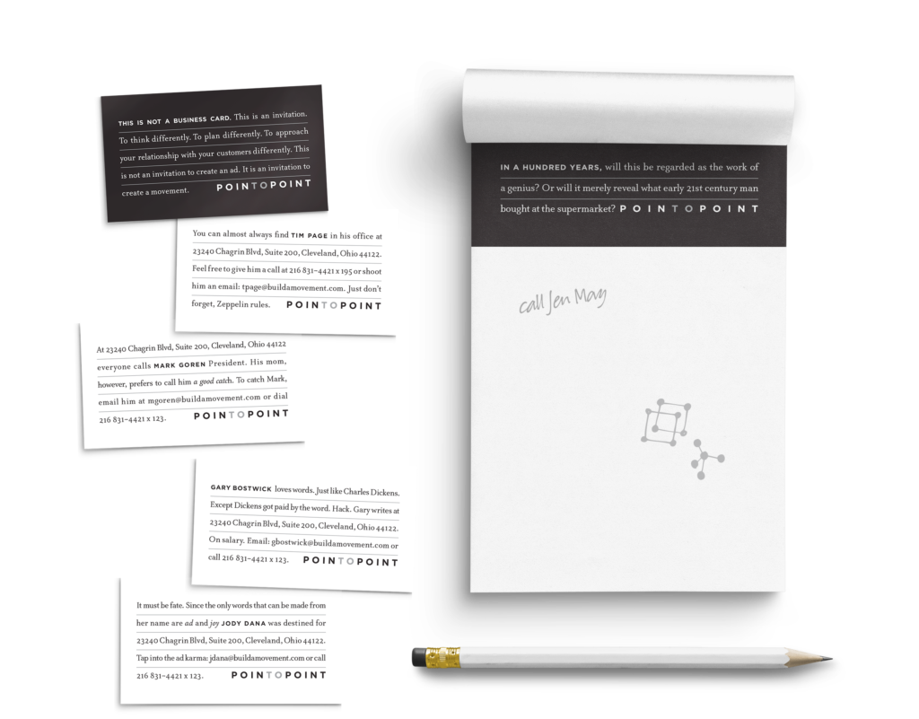 PROJECT SCOPE: Stationery system | MY ROLE: Art director | WRITER + CREATIVE DIRECTOR: Mike Hudock | AGENCY: Point to Point