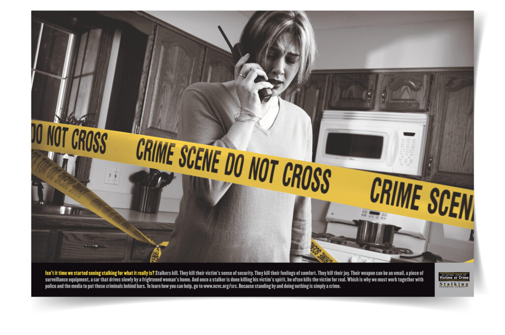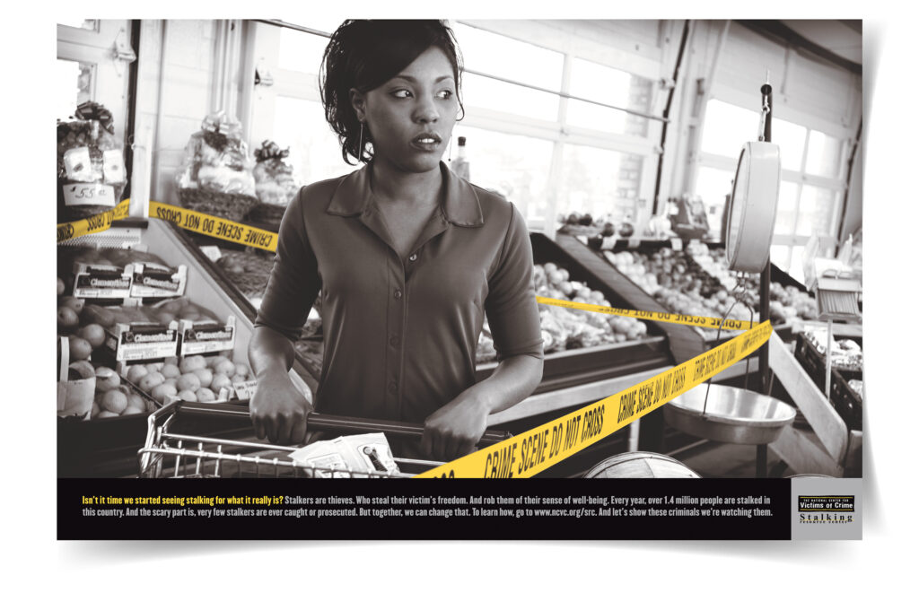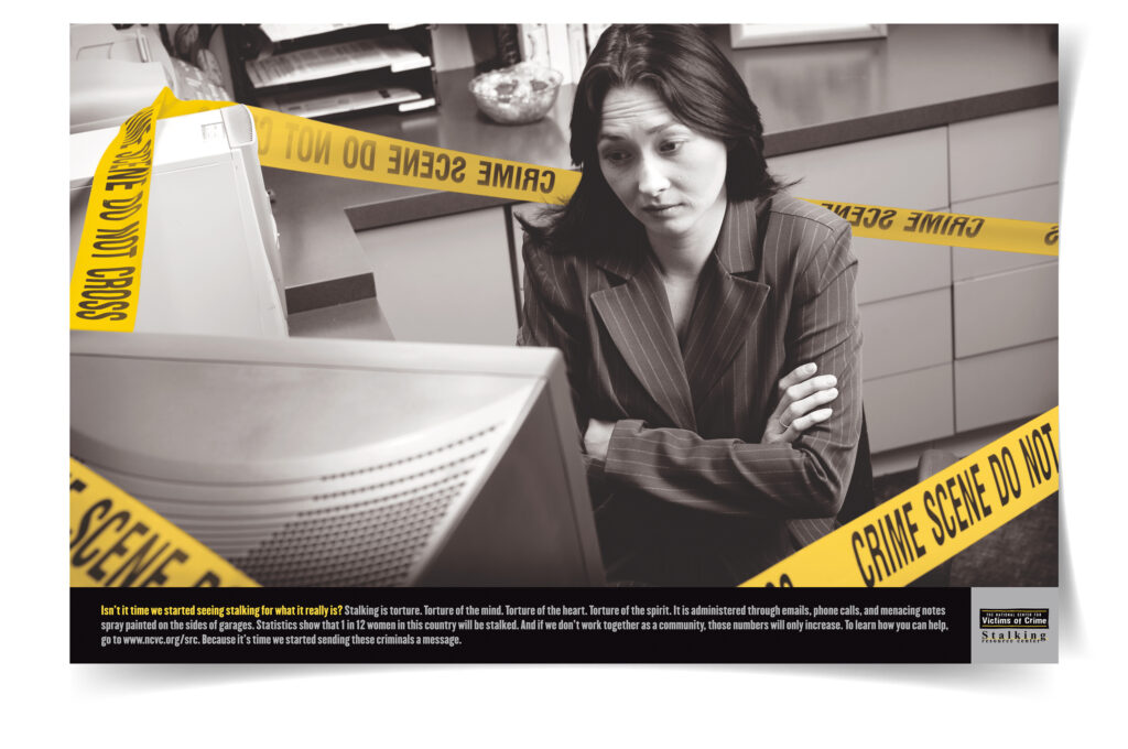 PROJECT SCOPE: For Stalking Awareness Month, create posters that will garner attention everywhere from police stations and libraries to federal assistance offices | MY ROLE: Art director | WRITER + CREATIVE DIRECTOR: Mike Hudock | AGENCY: Point to Point | PHOTOGRAPHER: Walt Seng