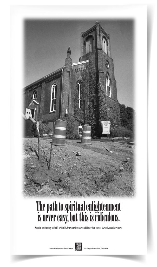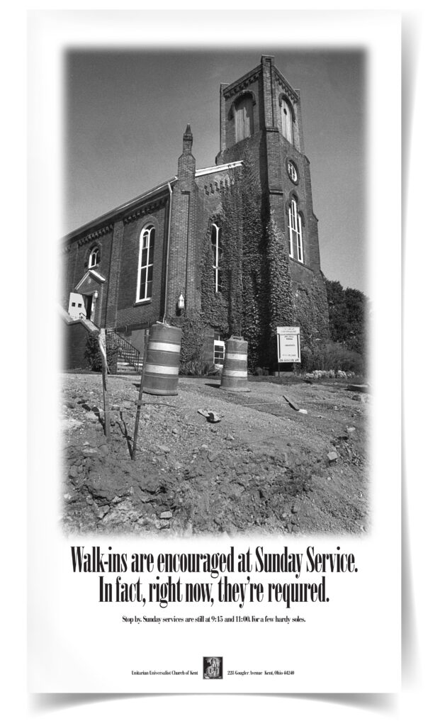 Designed to be hung in storefronts across Kent, these posters let the congregation know that the church was open during a major street repair project and to encourage parishioners to make the effort to attend services.